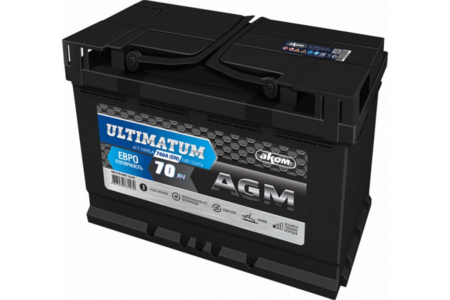 - Модель: Аккумулятор АКОМ ULTIMATUM 70 AGM Евро (70 A/h), 760А R+
